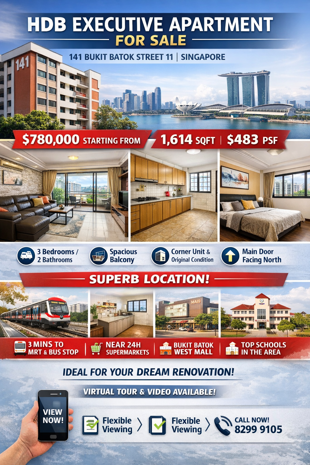 The Executive Apartment at 141 Bukit Batok Street 11 represents a unique opportunity to own a spacious and well-located home in Singapore. With its generous layout, strategic location, and strong investment potential, it appeals to both homeowners and investors. Whether you are looking for a family home or a property investment, this listing offers a compelling combination of value, convenience, and future growth.