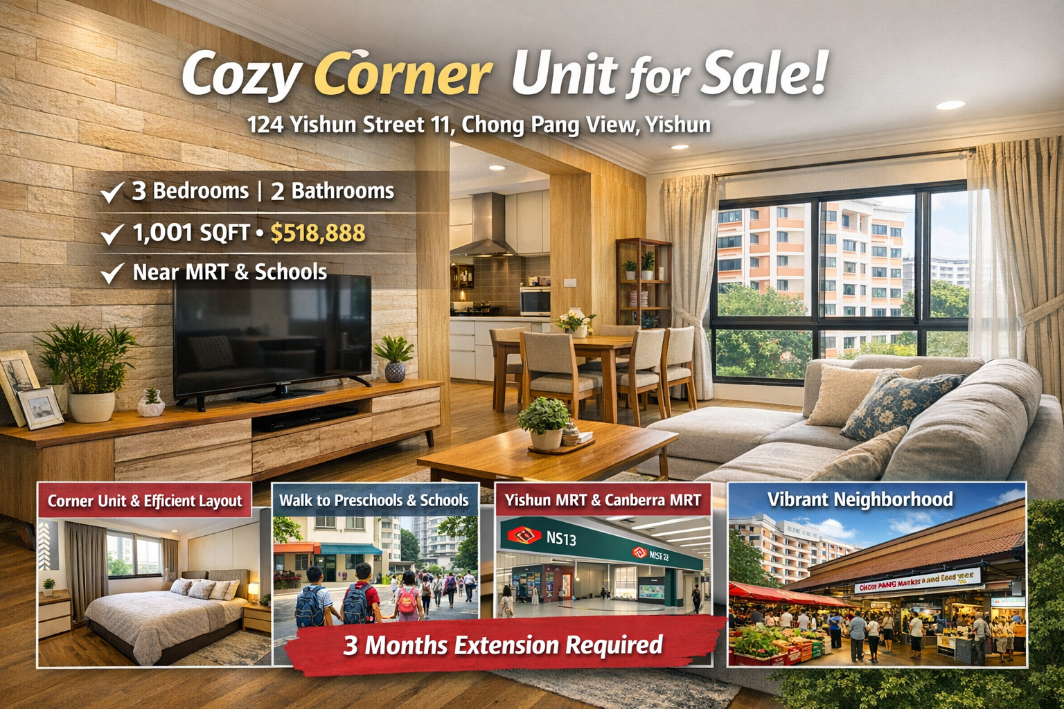 The real estate market in Singapore continues to attract both local buyers and international investors due to its stability, modern infrastructure, and high-quality living standards. Among the many residential options available, HDB flats remain one of the most popular choices for families seeking affordability and convenience. This article explores a cozy corner unit for sale at Chong Pang View, located at 124 Yishun Street 11 in the vibrant town of Yishun. If you are searching for a family-friendly home with an efficient layout, strategic location, and strong long-term value, this property listing deserves your attention.